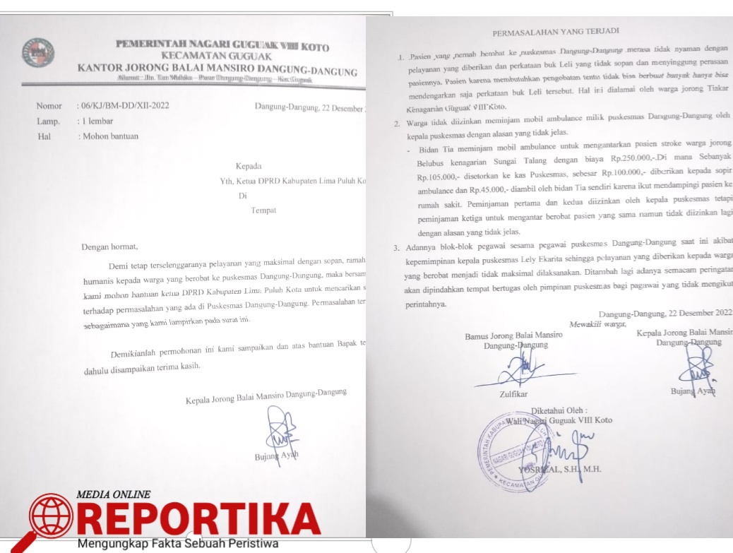 Reportika.co.id || Limapuluh Kota – Sepertinya kompilasi kekesalan Warga khususnya Nagari Guguak VIII Koto, Kecamatan Guguak, Kabupaten Limapuluh Kota terhadap kepemimpinan Kepala Puskesmas (Kapus) Danguang Danguang sudah sampai ke ubun ubun.