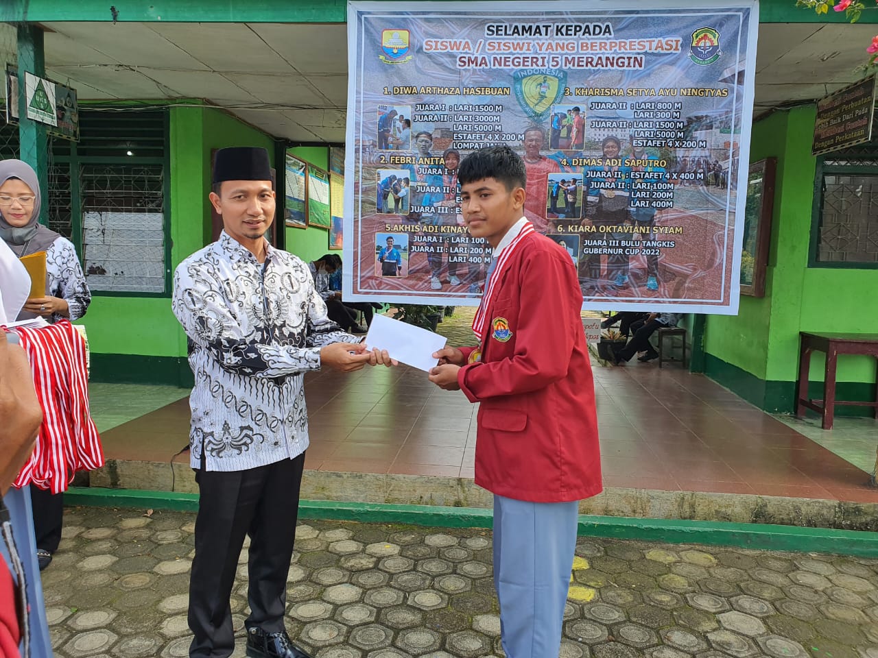 Reportika.co.id || – Sebagai bentuk apresiasi bagi siswa yang berprestasi di bidang olahraga, SMAN 5 Merangin memberikan penghargaan berupa uang pembinaan yang diserahkan secara langsung oleh Kepala Sekolah Henang Priyanto, S.Pd, M.Si, di halaman sekolah, Senin (25/7/22).