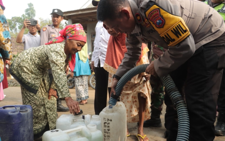 Kapolsek Ngoro Kompol Heru Purwandi bersama anggotanya dan babinsa setempat mengisikan air bersih ke jerigen emak-emak. Nampak wajah mereka sumringah mendapatkan bantuan air bersih dari Polres Mojokerto. Setelahnya, air dari truk tangki dipindahkan ke beberapa tandon yang disiapkan warga Dusun Kandangan.