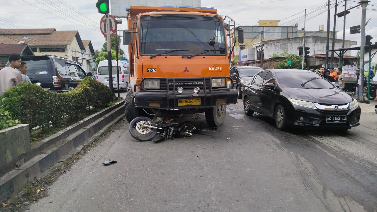 Lanjutnya pada saat ditempat kejadian Sepeda Motor Honda Supra x BK-6617-RX menyebrang jalan dari arah jalan Dr. Wahidin menuju jalan Gajah Mada dengan menyeberang jalan Sukarno Hatta, disaat bersamaan datang mobil Dump Truck Mitsubishi Fuso BK-9464-CS sehingga terjadi kecelakaan yang tidak dapat dihindarkan, dimana bagian depan mobil Dump Truck Mitsubishi Fuso BK-9464-CS menabrak bagian samping sebelah kanan sepeda motor Honda Supra X BK-6617-RX yang mengakibatkan pengendara dan sepeda motor terjatuh dibawah kolong mobil Dump Truck Mitsubishi Fuso-9464-CS.