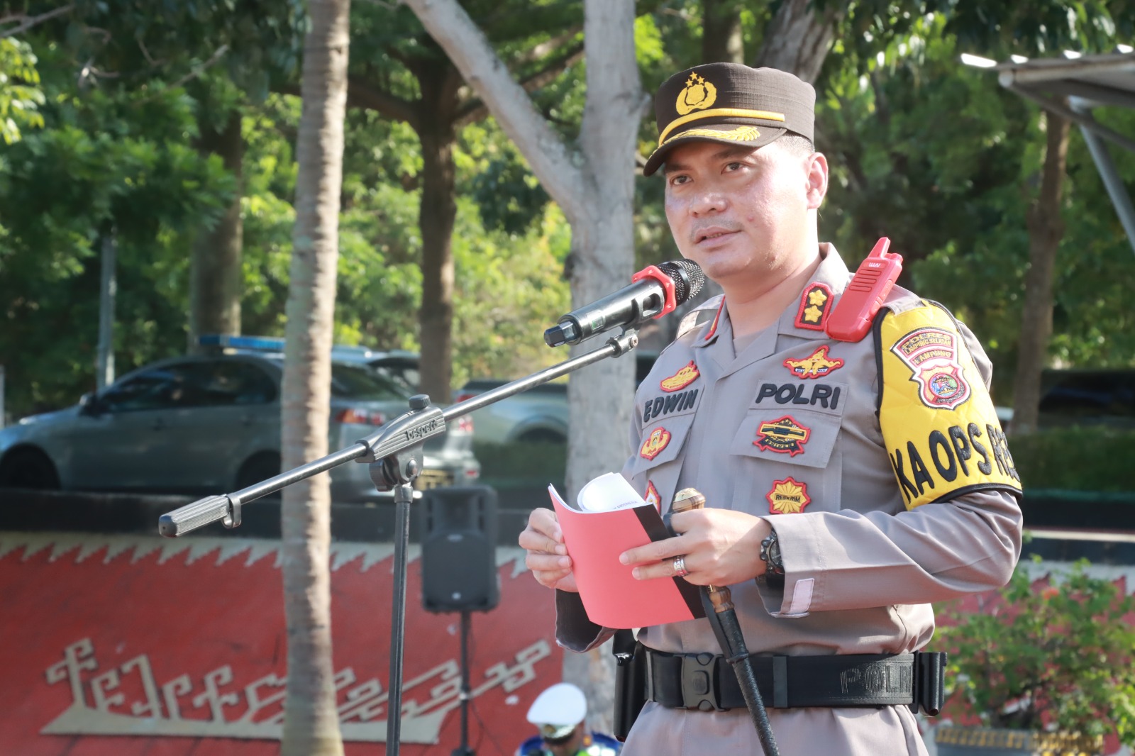 Kapolres Lampung Selatan AKBP Edwin sebagai inspektur upacara membacakan amanat operasi Ketupat 2023 dari Kapolri dihadapan peserta apel yang terdiri dari Polri, TNI Kodim 0421, TNI Denpom AD, Pol PP, Dishub, Dinas Kesehatan, Damkar, Basarnas, HK, BPBD Lampung Selatan, Senkom, Pramuka dan instansi pendukung lainnya.