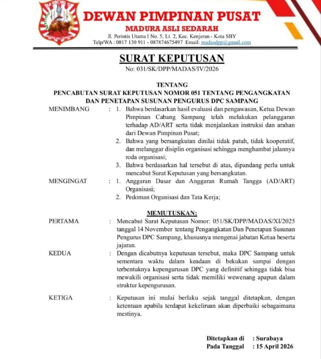 Dalam amar keputusan, DPP secara tegas mencabut SK sebelumnya, yakni Nomor: 051/SK/DPP/MADAS/XI/2025 tertanggal 14 November 2025 tentang pengangkatan dan penetapan susunan pengurus DPC Sampang, khususnya jabatan ketua beserta jajarannya.