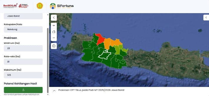 Sistem prediksi pada Website Sifortuna dibagi ke dalam tiga kategori warna, yaitu: (1) Hijau, menandakan kondisi lahan dan tanaman cocok untuk masa tanam atau panen. (2) Kuning, menunjukkan kondisi pertimbangan karena adanya potensi serangan hama (OPT) sehingga perlu langkah antisipasi. (3) Merah, menandakan kondisi tidak cocok karena risiko serangan hama atau faktor lain yang tinggi.