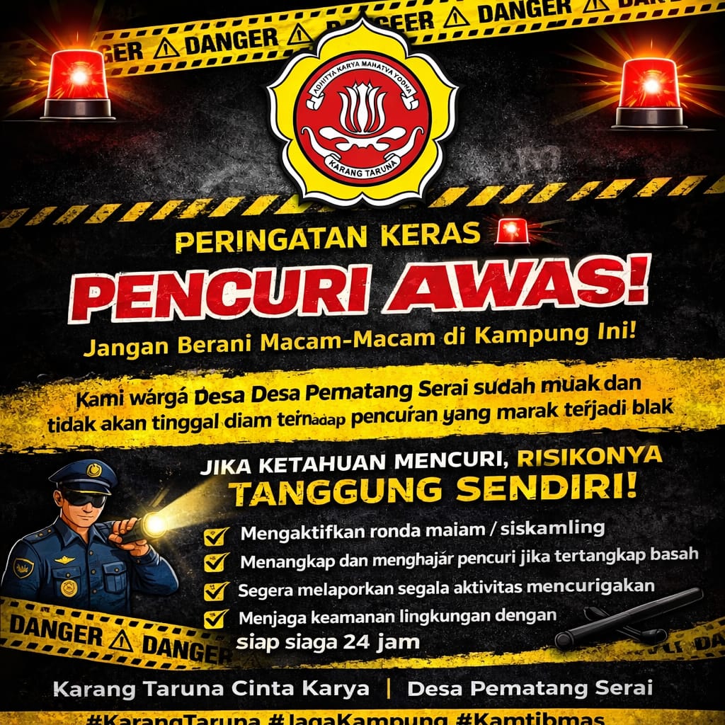 “Keamanan lingkungan adalah tanggung jawab bersama. Oleh karena itu, kami mengajak seluruh elemen masyarakat untuk bersatu, saling peduli, dan tidak bersikap apatis terhadap segala bentuk ancaman keamanan di lingkungan kita,” Tutup Ketua Karang Taruna Cinta Karya Desa Pematang Serai.