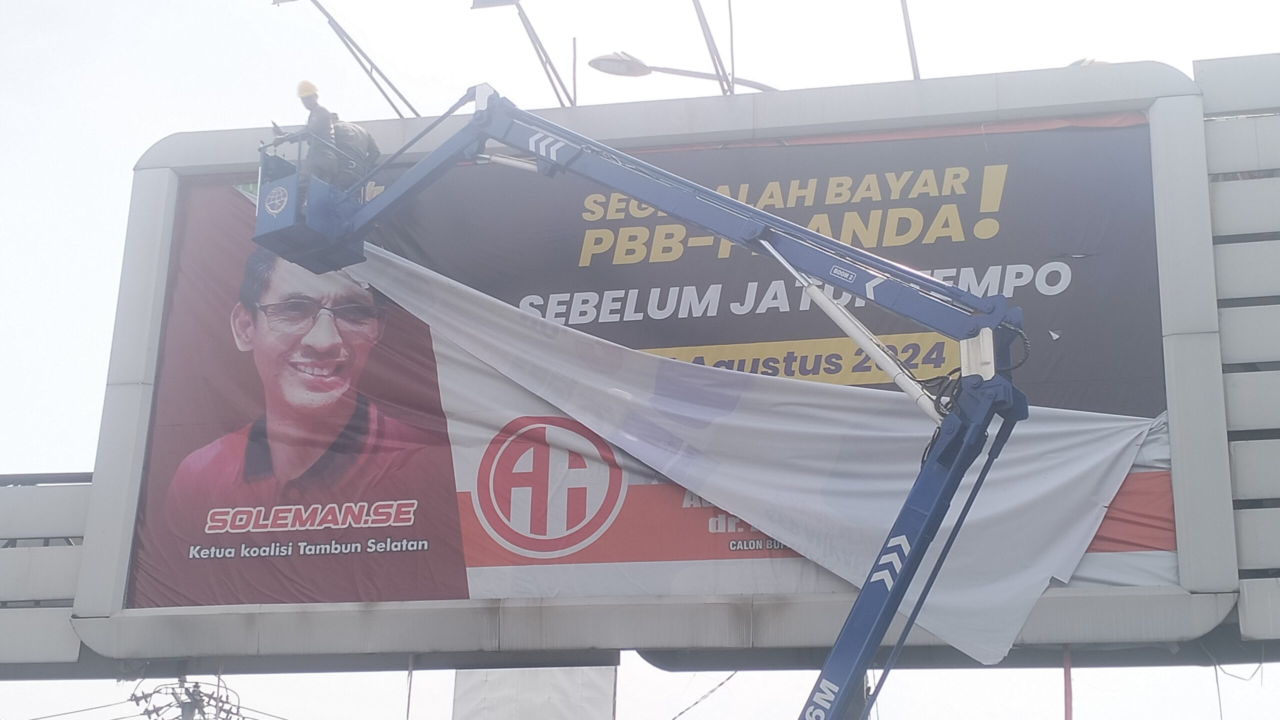 Surya juga mengungkap, untuk menurunkan baliho yang terpasang pada billboard yang tinggi, pihaknya menurunkan alat berat berupa mobil crane sky lift dari Dinas Perhubungan dan Disperkimtan Kabupaten Bekasi untuk bisa menjangkau APK yang terpasang diketinggian.