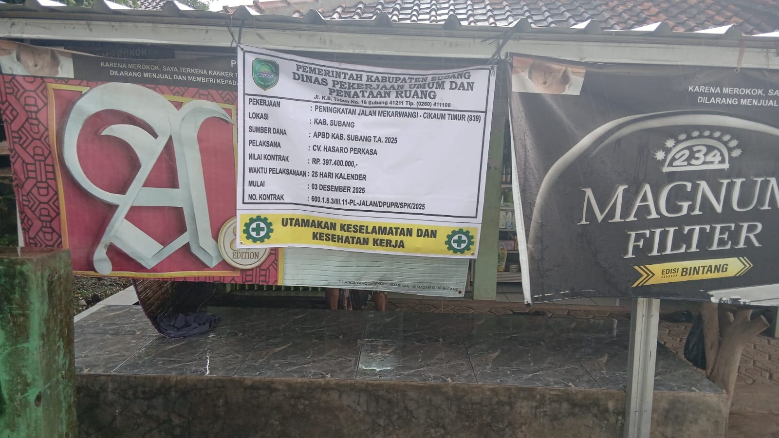 Reportika.id || Subang, Jabar – Proyek pekerjaan peningkatan jalan Mekar Wangi- Cikaum Timur (939), lokasi Kabupaten Subang, sumber dana APBD Kabupaten Subang TA. 2025, pelaksana CV. Hasaro Perkasa, nilai kontrak Rp. 397.400.000,-, waktu pelaksanaan 25 hari kalender, mulai 03 Desember 2025, no. Kontrak 600.1.8.3/lll.11-PL-JALAN/DPUPR/SPK/2025.
