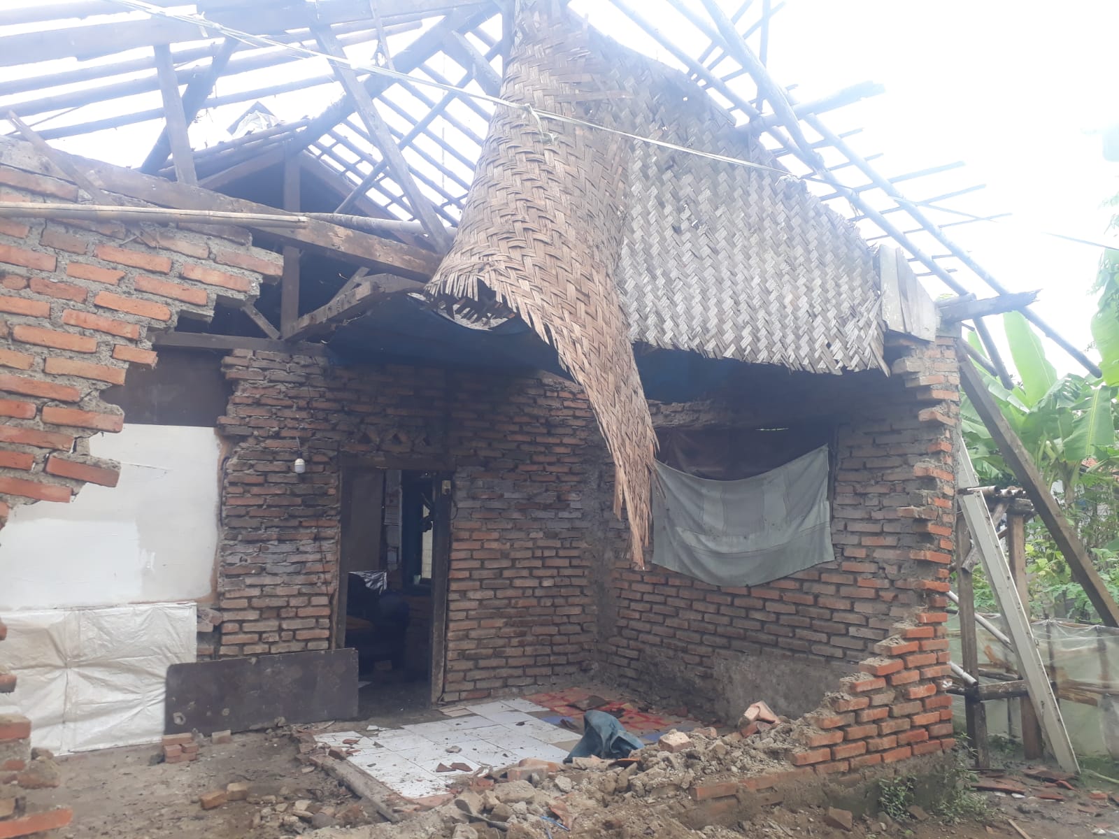 Diceritakan Udin, kejadian tersebut terjadi saat hujan yang memang tak kunjung reda pada hari jumat lalu, ditambah dengan angin yang cukup kencang, sehingga rumahnya roboh, akibat tak kuat menahan terpaan angin dan guyuran hujan.