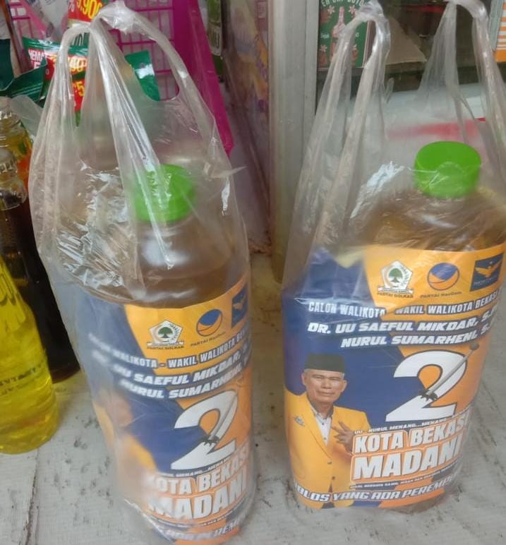 Hal ini dengan banyak temuan beredarnya sebotol minyak goreng ditengah masyarakat yang dibungkus plastik dan tak lupa diselipkan stiker atau flayer gambar pasangan UU Nurul.