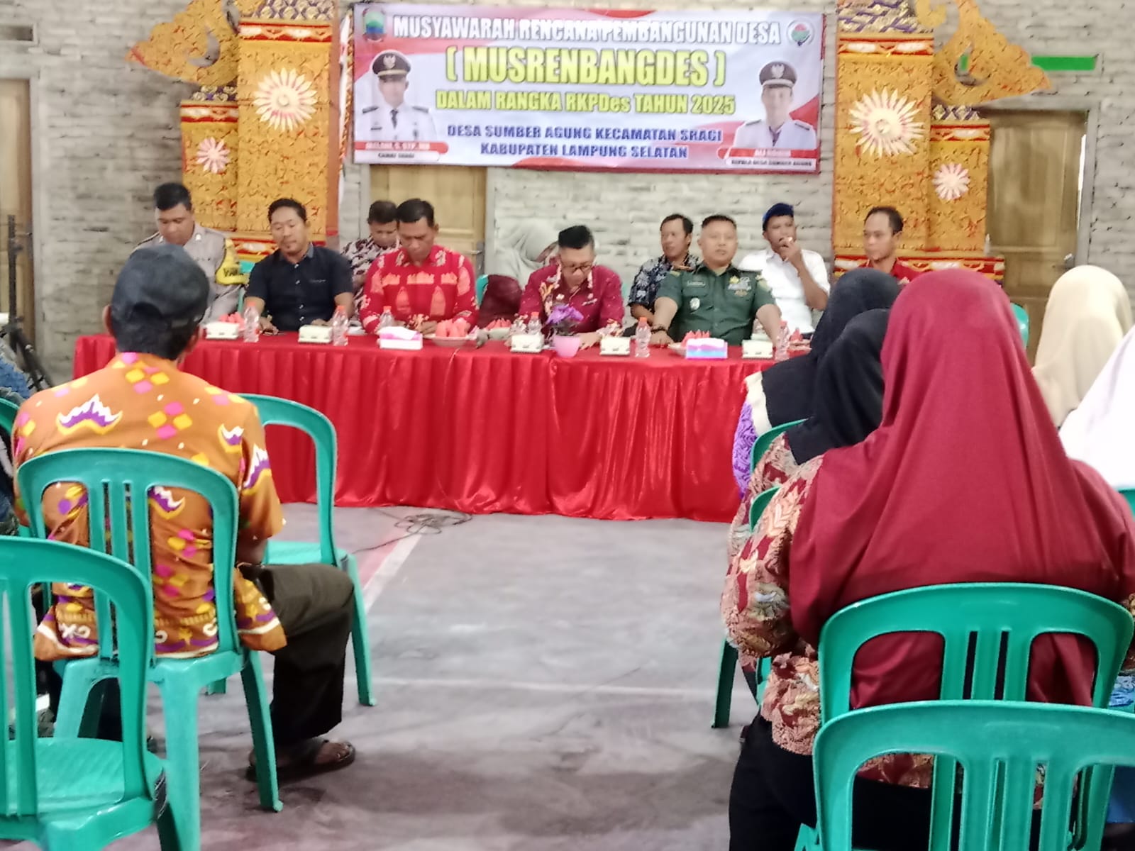 Reportika.co.id || Lampung Selatan, Lampung – Desa Sumber Agung Kecamatan Sragi Kabupaten Lampung Selatan memproritaskan jalan antar Desa dan antar Kecamatan, Normalisasi sungai pengadaan irigasi tersier dan sumur bor, serta intalasi listrik lingkungan dan listrik pertanian, hal ini di sampaikan dalam acara Musrenbang Desa tahun anggaran 2025 kamis 7/11/2024