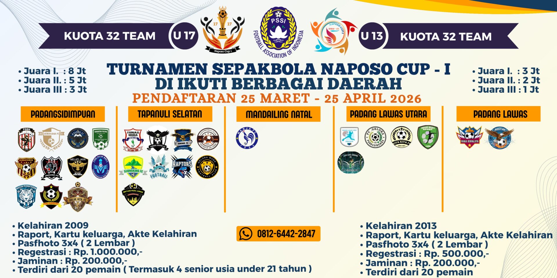 Pendaftaran peserta dibuka hingga 25 April 2026, dengan cakupan wilayah meliputi Padangsidimpuan, Tapanuli Selatan, Mandailing Natal, Padanglawas Utara, dan Padanglawas. Panitia memberikan kesempatan luas bagi tim yang mewakili sekolah, desa, maupun SSB (Sekolah Sepakbola) untuk berpartisipasi.