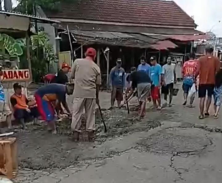 Puluhan warga bergotong royong menambal lubang-lubang jalan dengan material seadanya. Mereka patungan atau urunan demi membuat jalan sedikit lebih layak dilalui dan mengurangi risiko kecelakaan. Menurut keterangan warga, kerusakan jalan tersebut sudah terjadi cukup lama.