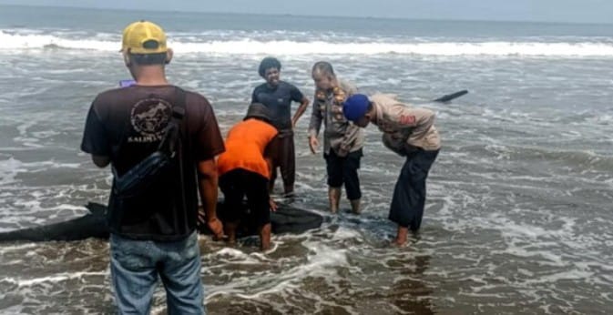 Paus Botol Ditemukan Warga Terdampar di Pantai Citepus Pelabuhan Ratu