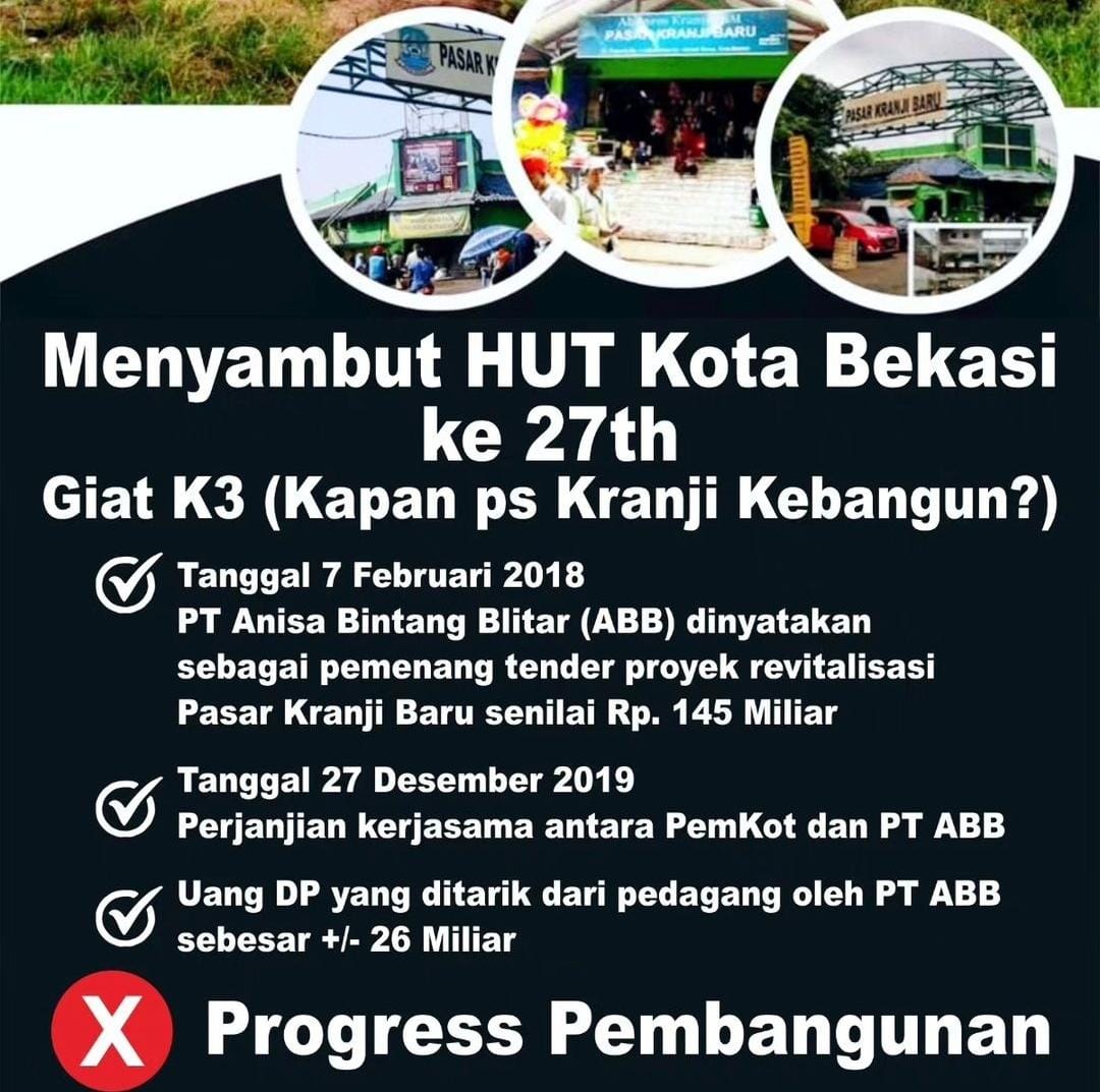 “Selamat HUT Kota Bekasi Ke-27, Sehingga warga pedagang pasar kranji dapat kembali berkumpul dalam satu gedung dan perekonomian pedagang bisa kembali bangkit dan membaik,” ungkapnya.