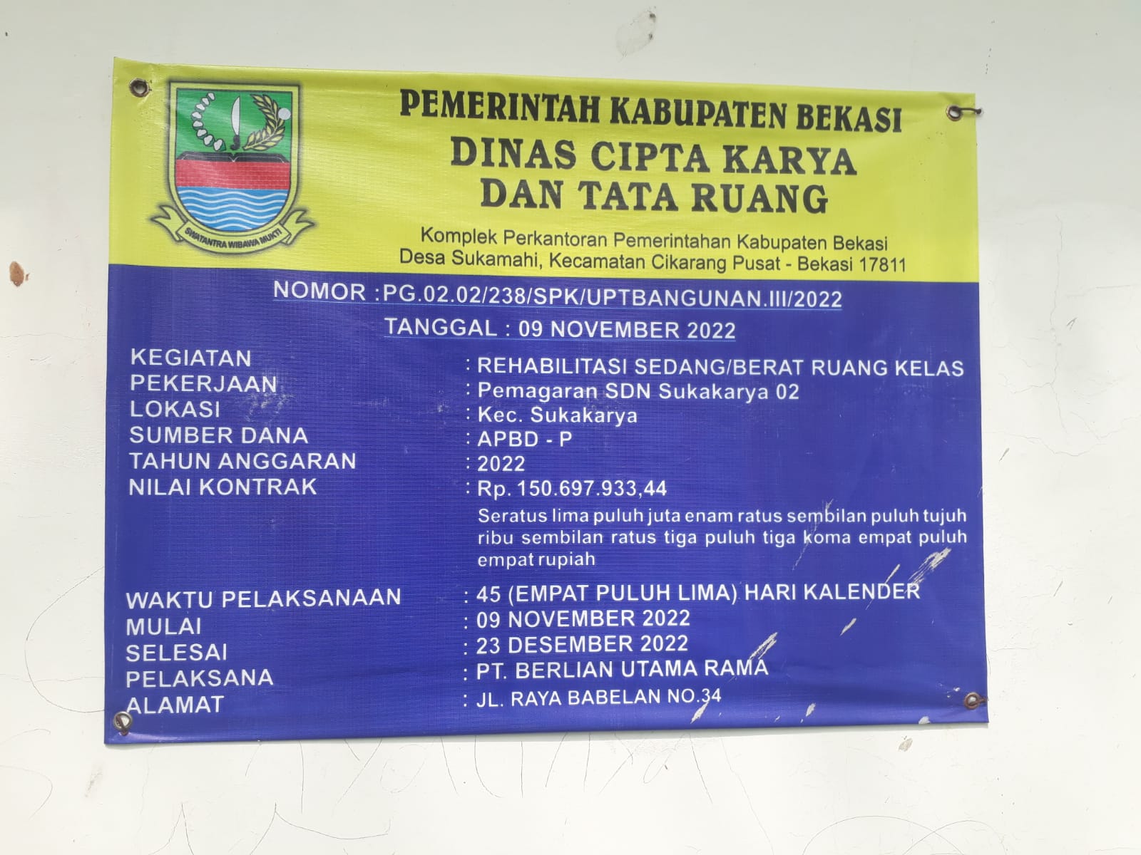 Pekerjaan melalui Dinas Cipta Karya Dan Tata Ruang Kabupaten Bekasi ini berasal dari anggaran APBD – P tahun anggaran 2022.Nomor : PG 02.02./238/SPK/UPTBANGUNAN.III/2022, judul kegiatan REHABILATASI SEDANG/BERAT pekerjaan pemagaran SDN Sukakarya 02.