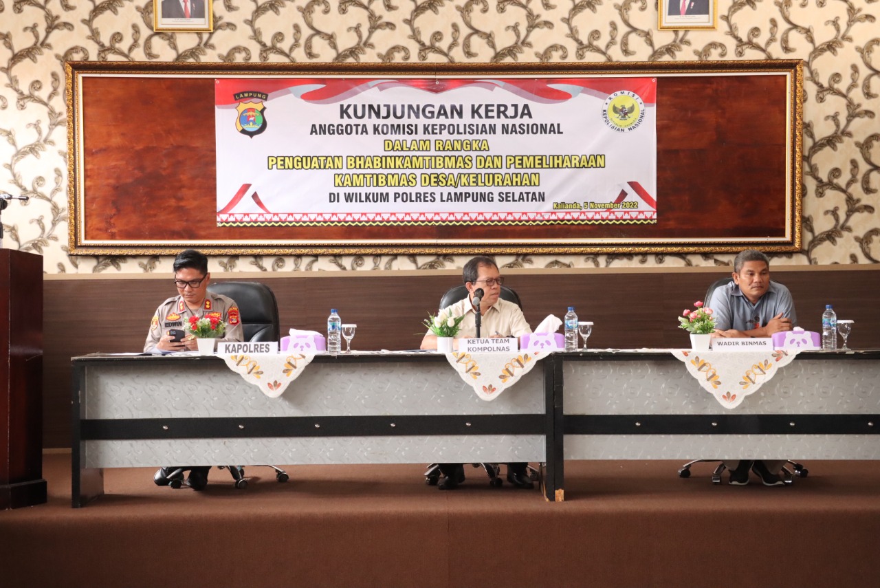 Kunjungan kerja Komisi Kepolisian Nasional Indonesia (Kompolnas) ini dilakukan berkenaan dalam rangka, penguatan Bhabinkamtibmas dan pemeliharaan kamtibmas tingkat Desa/Kelurahan khususnya melingkupi di Wilayah hukum Polres Lampung Selatan.