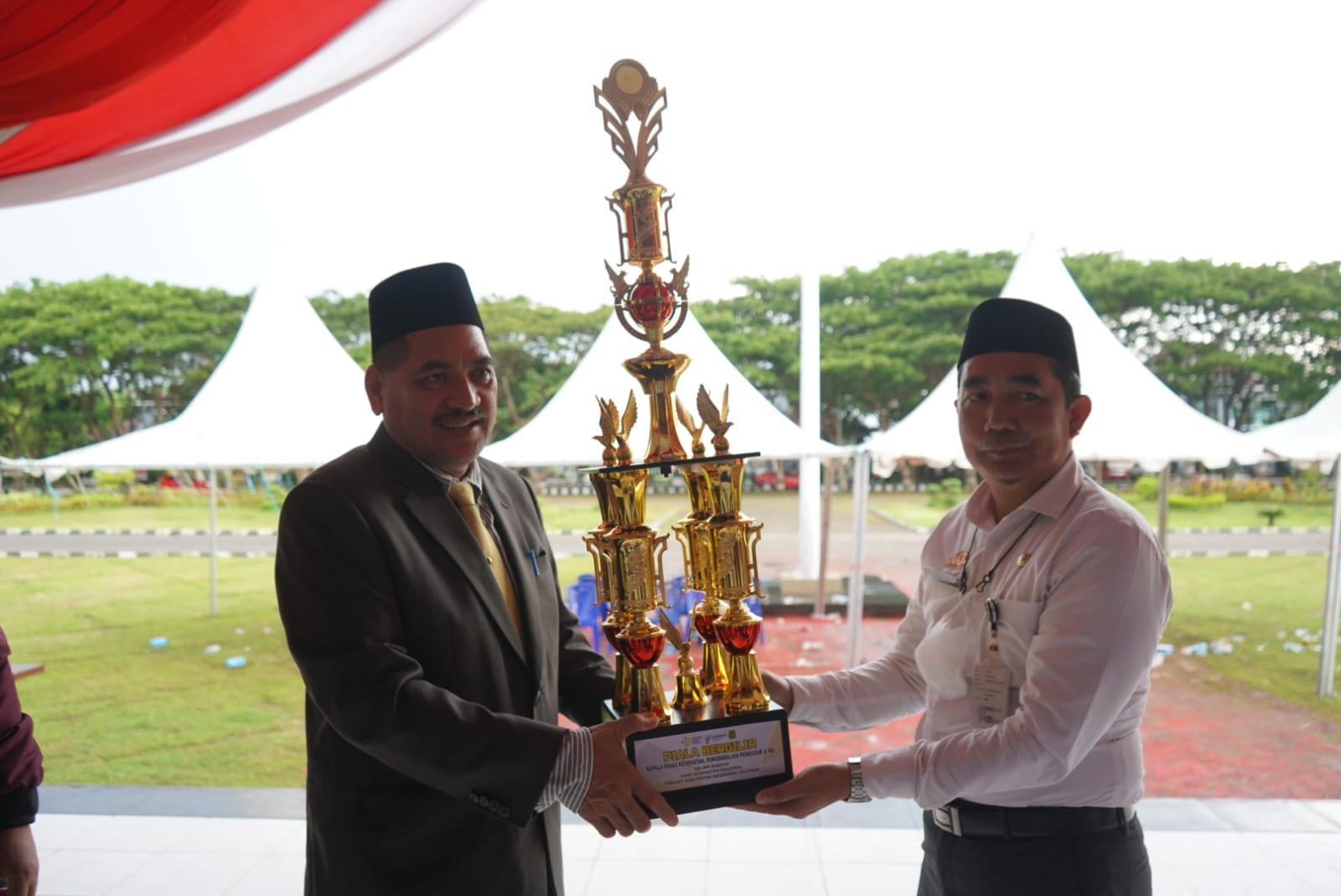 Pj. Sekda Sidrap yang juga kadis Dinas Kesehatan, Pengendalian Penduduk dan KB, H. Basra menyerahkan piala kepada juara umum. Ia pun menyampaikan selamat kepada para pemenang.