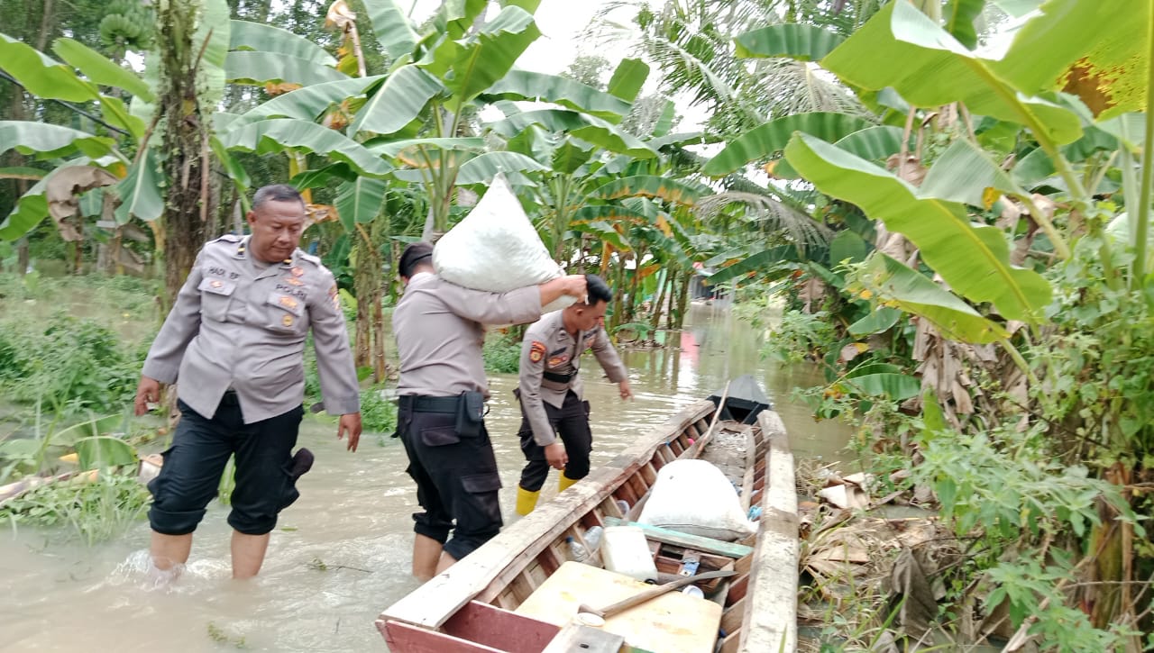 Personel Sat Samapta turun langsung ke lokasi terdampak banjir membantu warga mengangkat barang berharga mereka ke perahu.