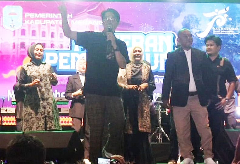 Reportika.co.id || Merangin, Jambi – Penjabat (Pj) Bupati Merangin Jangcik Mohza dan Ketua DPRD Merangin M Rivaldi, mengimbangi penampilan Dide Irawan vokalis Grup Band Hijau Daun, pada Panggung Hiburan Rakyat HUT ke-75 Kabupaten Merangin, Minggu malam (22/12).