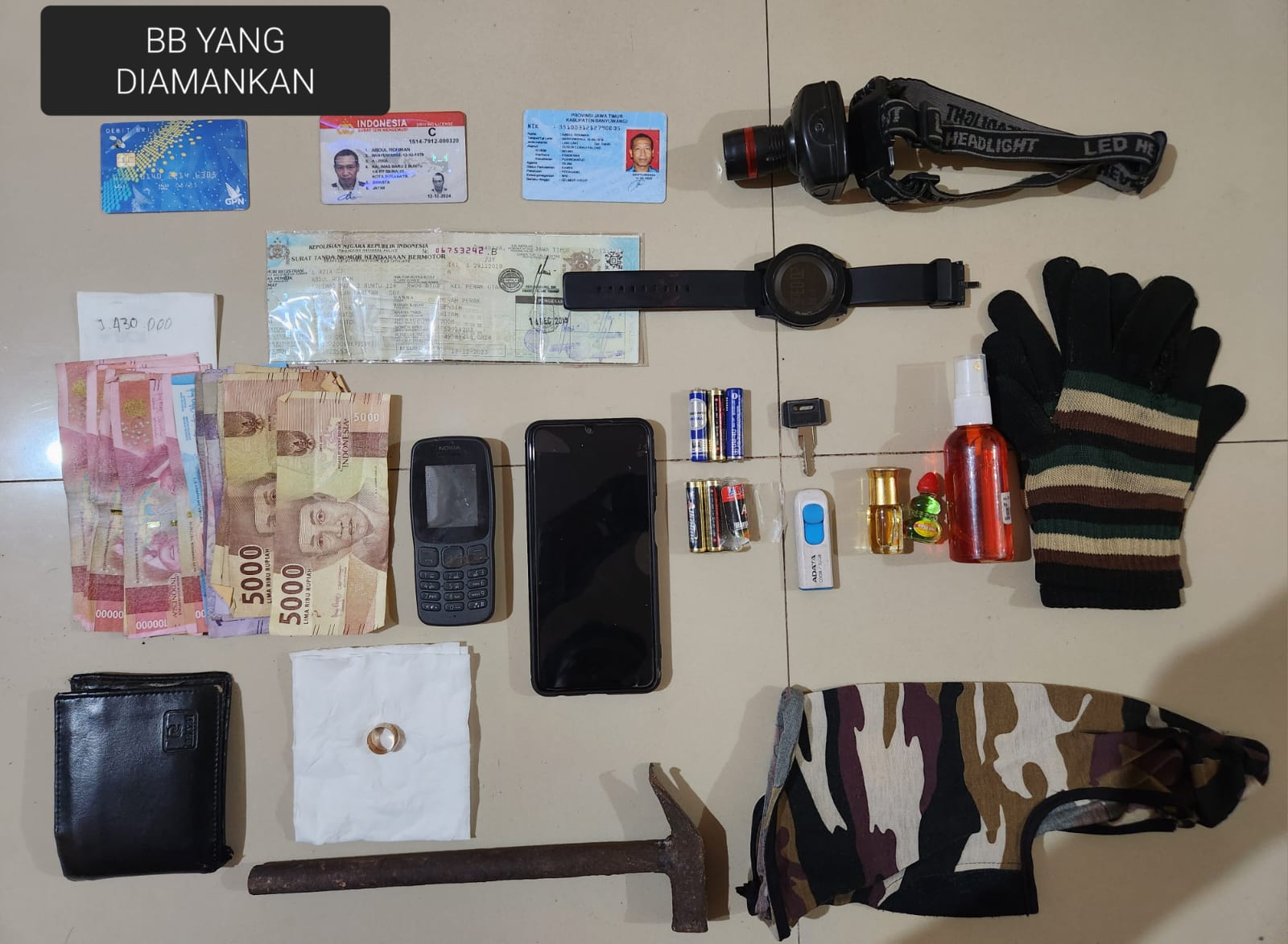 Bersamaan dengan itu, polisi menyita sejumlah barang bukti diantaranya dua buah HP Merk Samsung Galaxy A22 dan Nokia warna Hitam, satu unit sepeda motor Yamaha Jupiter warna merah beserta kunci dan STNK, sebuah senter kepala, sebuah palu, _buff_ (penutup kepala) warna Loreng, sepasang sarung tangan kain, sebuah jam tangan warna Hitam, uang tunai senilai Rp. 1.430.000, serta dompet warna hitam beserta identitas diri pelaku.