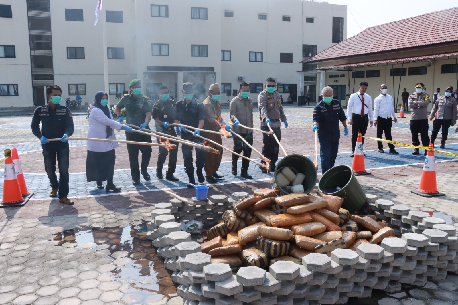 Perwakilan dari Forkopimda, Bupati Lampung Selatan, Ketua DPRD Lampung Selatan, Ketua Pengadilan Negeri Lampung Selatan, Dandim 0421 Lampung Selatan, Kajari Lampung Selatan, dan Penasihat Hukum, turut dalam acara pemusnahan barang bukti narkoba, dihalaman Polres Lampung Selatan.