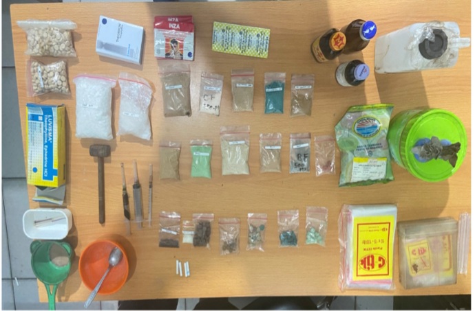 Kemudian satu kantong bubuk warna hijau tosca yang dibungkus dengan plastik klip bening, satu kantong bubuk warna hijau yang dibungkus dengan plastik klip bening, enam kantong bubuk warna coklat yang dibungkus dengan plastik klip bening, satu kotak obat merk luvisma, dua kantong obat berisi pil ephedrine warna coklat, satu bungkus pewarna makanan merk sunsea brand dan lainnya.