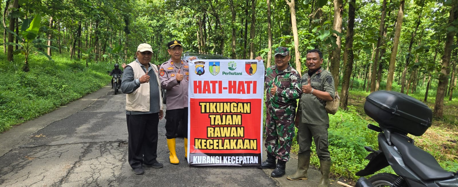 Reportika.co.id || Kediri, Jatim – Kapolsek Kandangan AKP Wahyu Hariadi bersama Forkopimca dan petugas Perhutani melakukan pemasangan banner imbauan rawan kecelakaan di tikungan tajam Dusun Putuk Desa Banaran Kecamatan Kandangan Kabupaten Kediri, pada Kamis (16/1/2025)..