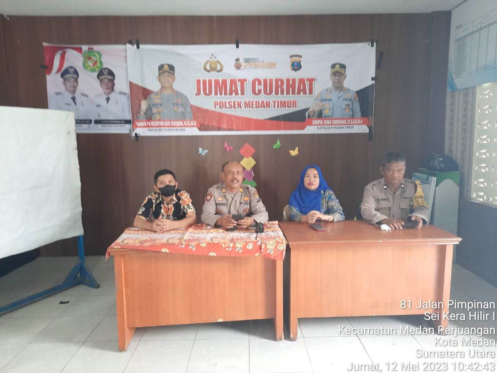 Reportika.co.id || Medan, Sumut – Polsek Medan Timur mengajak masyarakat untuk bersama-sama mengantisipasi atau mencegah aksi begal di wilayah Kelurahan Sei Kera Hilir I Kecamatan Medan Perjuangan. Hal itu dikatakam Kapolsek Medan Timur Kompol Rona Tambunan melalui Kanit Binmas AKP H Manurung saat kegiatan ‘Jumat Curhat’ bersama masyarakat di Kantor Lurah Sei Kera Hilir I Kecamatan Medan Timur Jalan Pimpinan Medan, Jumat (12/5/2023).