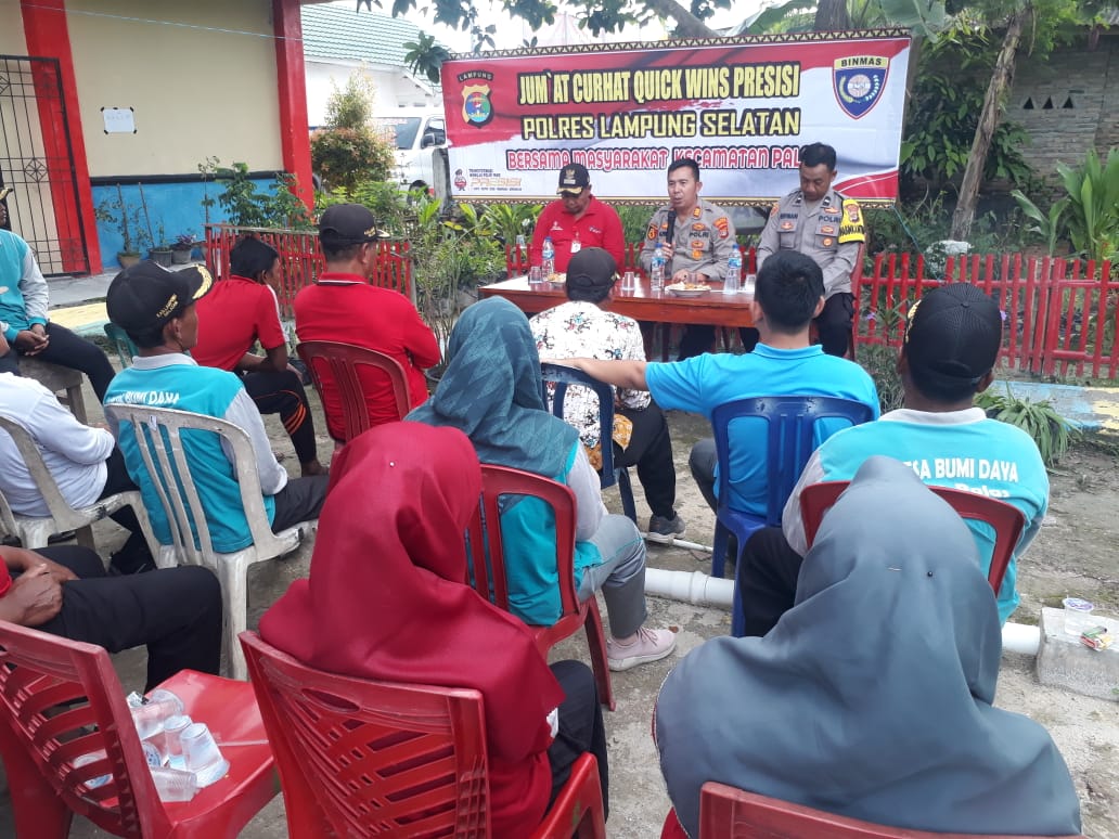Reportika.co.id || Palas, Lampung Selatan – Kepolisian Sektor (Polsek) Palas melaksanakan kegiatan Jumat Curhat Quick Win Presisi Polres Lampung Selatan bersama Aparatur desa , Tokoh masyarakat dan warga masyarakat Desa Bumi Daya Kecamatan Palas Kabupaten Lampung Selatan di halaman Balai Desa Bumidaya, Jumat, (10/3/2023).