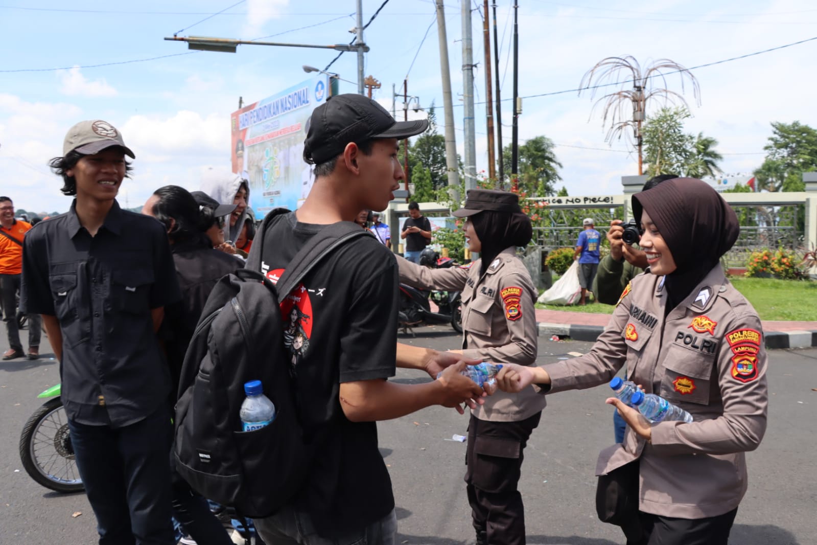 Reportika.co.id || Bandar Lampung – Polisi Wanita (Polwan) Polresta Bandar Lampung membagikan coklat dan air mineral kepada para peserta massa aksi unjuk rasa dalam peringatan Hari Buruh Internasional, Senin (1/05/2023) siang.