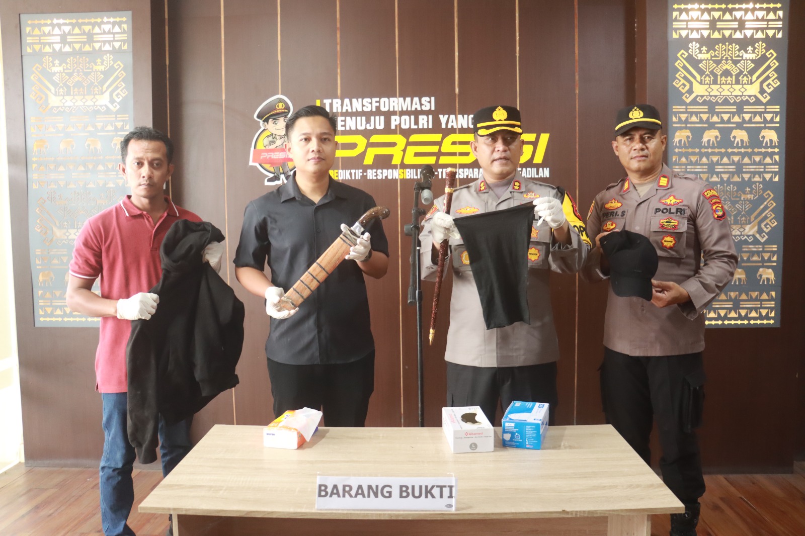 Dari tangan pelaku, polisi menyita sejumlah barang bukti, di antaranya satu bilah golok bersarung cokelat yang terdapat bercak darah, kain penutup wajah hitam, tas pinggang, topi, telepon genggam, serta jaket hoodie.