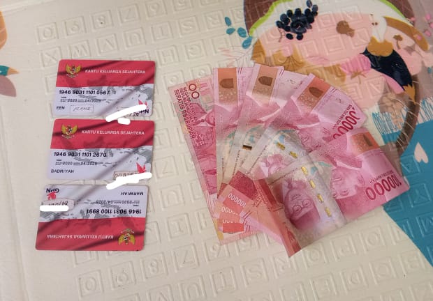 “Ya dah ibu nanti uang ibu saya ganti, dari beberapa ibu-ibu yang kartunya sudah di gesek oleh saya dan ini saya kasih uang untuk tiga kartu Rp.500.000 di bagi tiga ya ibu,”kata si anak oknum RT.