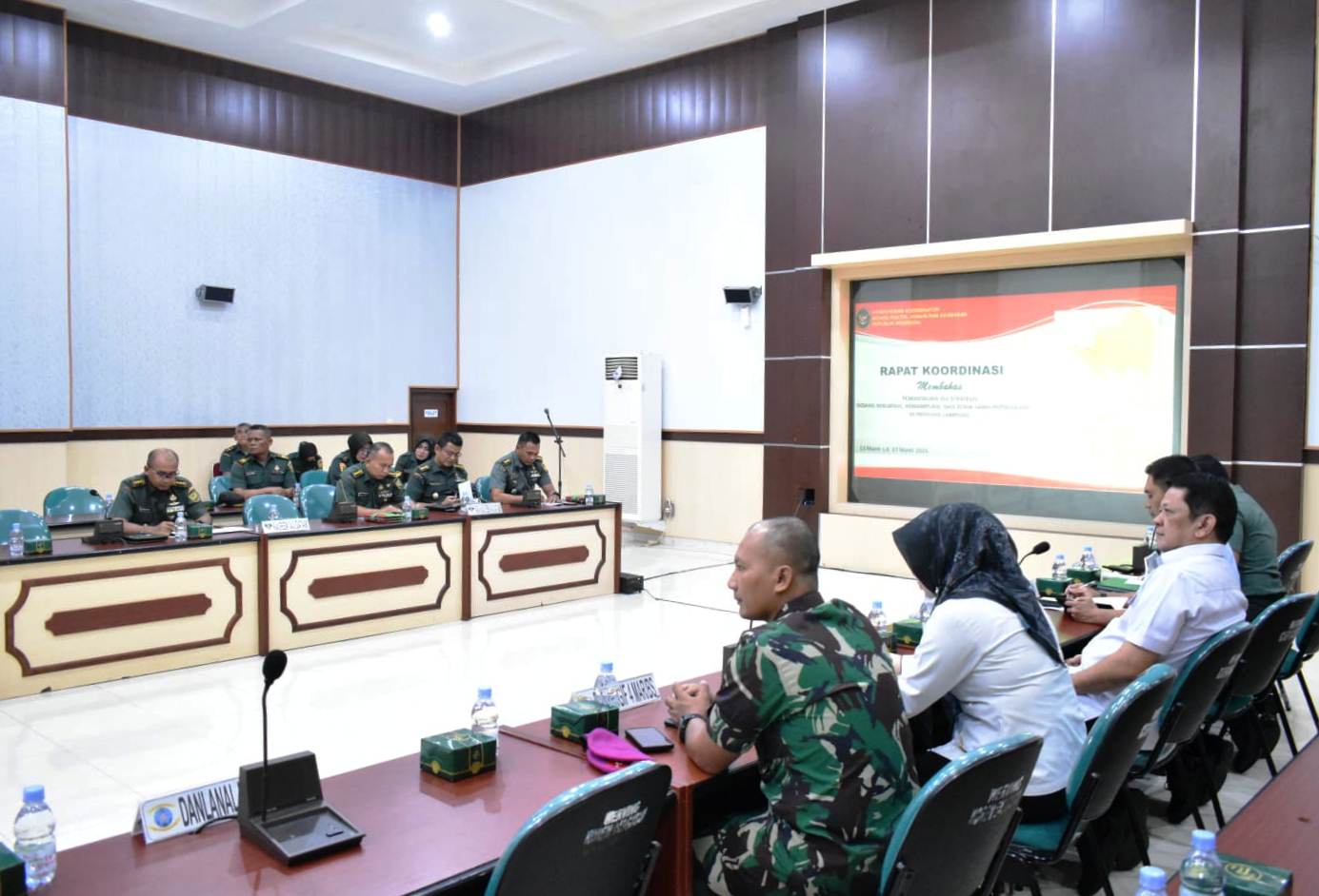 Rapat Kordinasi dan pertemuan Kemenpolhukam RI dalam rangka Rakor pelaksanaan pemantauan isu strategis bidang kekuatan, kemampuan dan kerjasama pertahanan di Provinsi Lampung dengan pejabat dan satuan TNI serta pejabat dari Pemerintah Provinsi Lampung, diantaranya Kasrem 043/Gatam, Para Kasi Kasrem 043/Gatam, Dandim 0410/KBL, Kaban Kesbangpol Provinsi Lampung, Kepala Bapeda Provinsi Lampung, Pas Ops Lanal Lampung, Kasi Intel Brigif 4 Mar BS, Danlanud P. Bunyamin, dan Pasilidpam Rem 043/ Gatam.