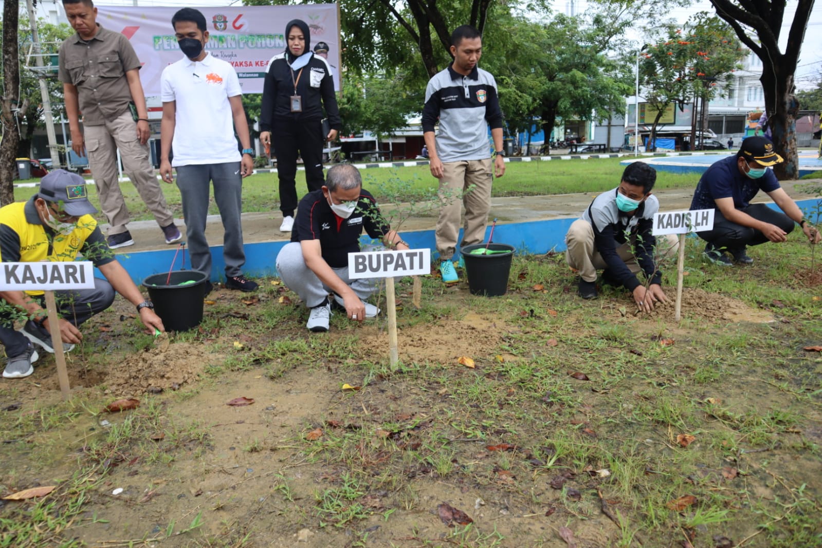 Amran Mahmud menyerahkan bibit pohon kepada Kepala Kejari Wajo, Ramdoni, dilanjutkan dengan penanaman pohon di RTH Callaccu yang jadi lokasi pertama.