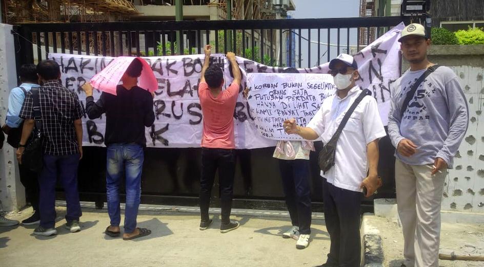 Dalam aksinya para pendemo menggelar aksi dipintu gerbang PN Kota Bekasi dibawah pengawalan petugas.