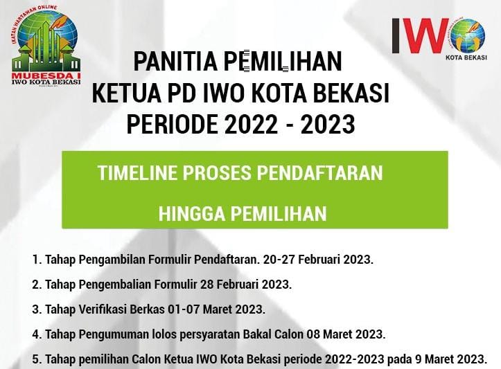 Ketua Tim Penjaringan Balon Ketua IWO Kota Bekasi Muhamad Galih F, didampingi Sektetaris Saut Manullang dan anggota Adien, Afril Naldhy menyampaikan, penjaringan dan penyaringan Balon Ketua IWO, dimulai tanggal 20 – 27 Februari 2023, dengan agenda pengambilan dan penyerahan formulir pendaftaran, serta persyaratan administrasi Balon Ketua.