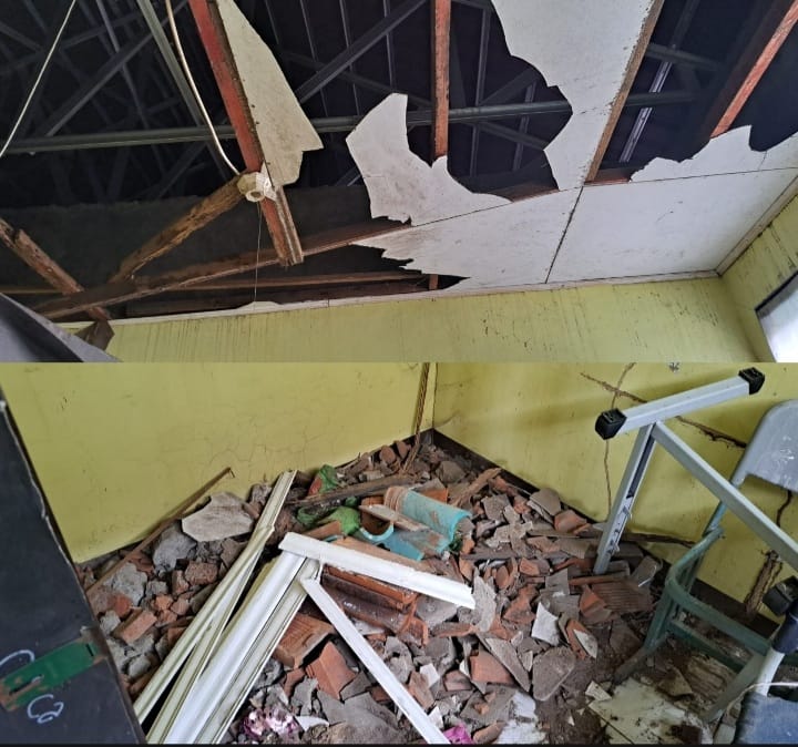 “Untuk saat ini khusus ruangan kelas sudah tidak layak huni mengingat atapnya sudah banyak mengalami kebocoran ketika hujan, plafonya juga sudah banyak lepas. Oleh sebab itu, ruang kelas ini kami kosongkan menghindari hal hal yang tidak di inginkan jika dipakai saat kegiatan belajar mengajar,” ujarnya Senin (25/07/2022).
