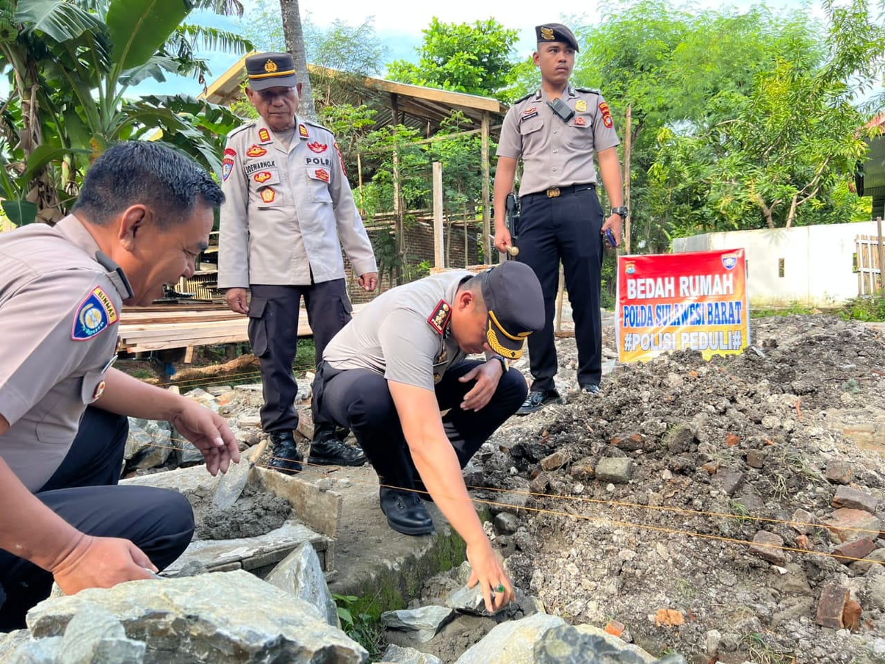Kapolres Majene AKBP Toni Sugadri saat ditemui mengatakan hari ini kita melakukan peletakan batu pertama pada kegiatan bedah rumah dari rumah Muslimin yang keadaannya cukup memprihatinkan.