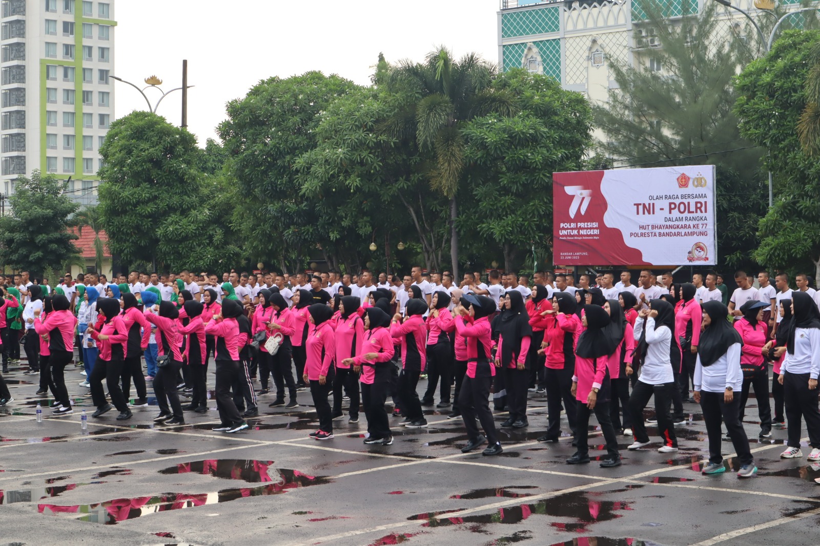 Kapolresta Bandar Lampung Kombes Pol Ino Harianto, S.I.K.,M.M., menjelaskan bahwa kegiatan olah raga bersama ini dilaksanakan selain dalam rangka menyambut Hari Bhayangkara Ke 77, juga guna mempererat sinergitas TNI – Polri.