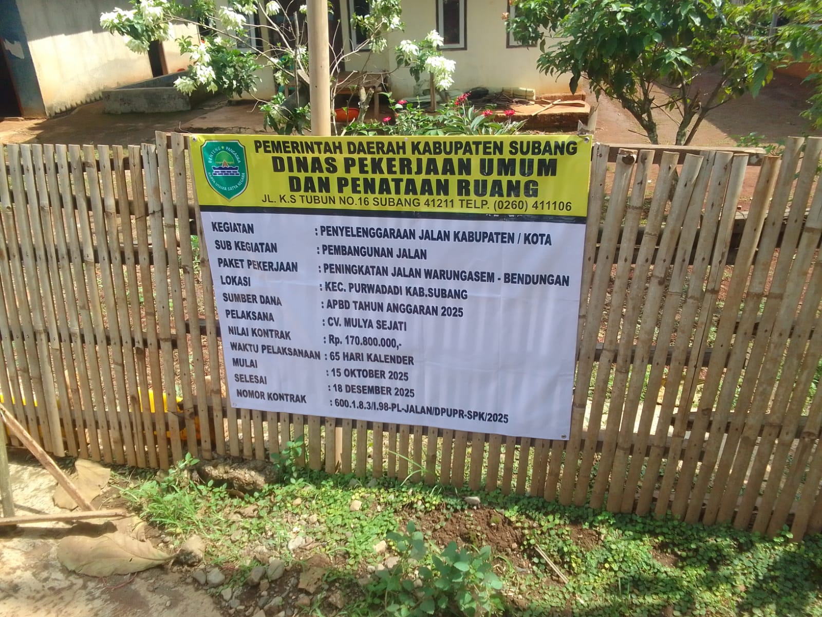 Reportika.id || Subang, Jabar – Senin, 17 November 2025. Sejumlah awak media menyambangi lokasi Kegiatan penyelenggaraan jalan Kabupaten/Kota, sub kegiatan pembangunan jalan, paket pekerjaan peningkatan jalan Warung Asem- Bendungan, lokasi Kecamatan Purwadadi Kabupaten Subang. pelaksana CV. Mulya Sejati, nilai kontrak Rp. 170.800.000,-, waktu pelaksanaan 65 hari kalender, mulai 15 Oktober 2025, selesai 18 Desember 2025, nomor kontrak 600.1.8.3/l.98-PL-JALAN/ DPUR-SPK/2025.