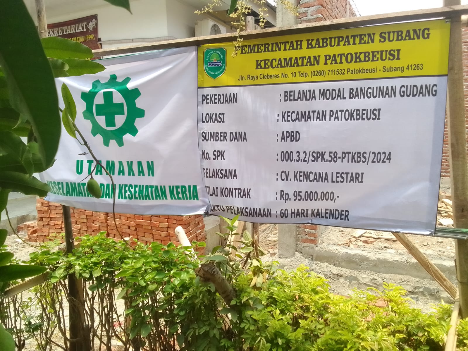 Dimana di papan informasi tertulis, Pemerintah Kabupaten Subang Kecamatan Patokbeusi. Pekerjaan : Belanja modal bangunan gudang. Lokasi : Kecamatan Patokbeusi. Sumber Dana : APBD. No.SPK : 000.3.2/SPK.58-PTKBS/2024. Pelaksana : CV. Kencana Lestari. Nilai Kontrak : Rp. 95.000.000,-. Waktu Pelaksanaan : 60 hari kalender.