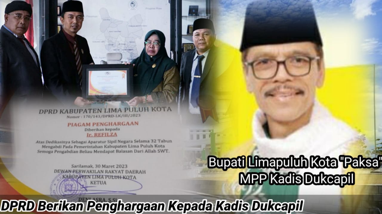 Ketua DPRD Limapuluh Kota, Deni Asra, S.Si kepada media ini mengatakan, benar, DPRD memberikan piagam Penghargaan kepada Ibuk Ir.Refilza Kadis Dukcapil Limapuluh Kota yang akan memasuki masa persiapan pensiun (MPP) 1 April 2023, Kamis 30 Maret 2023.