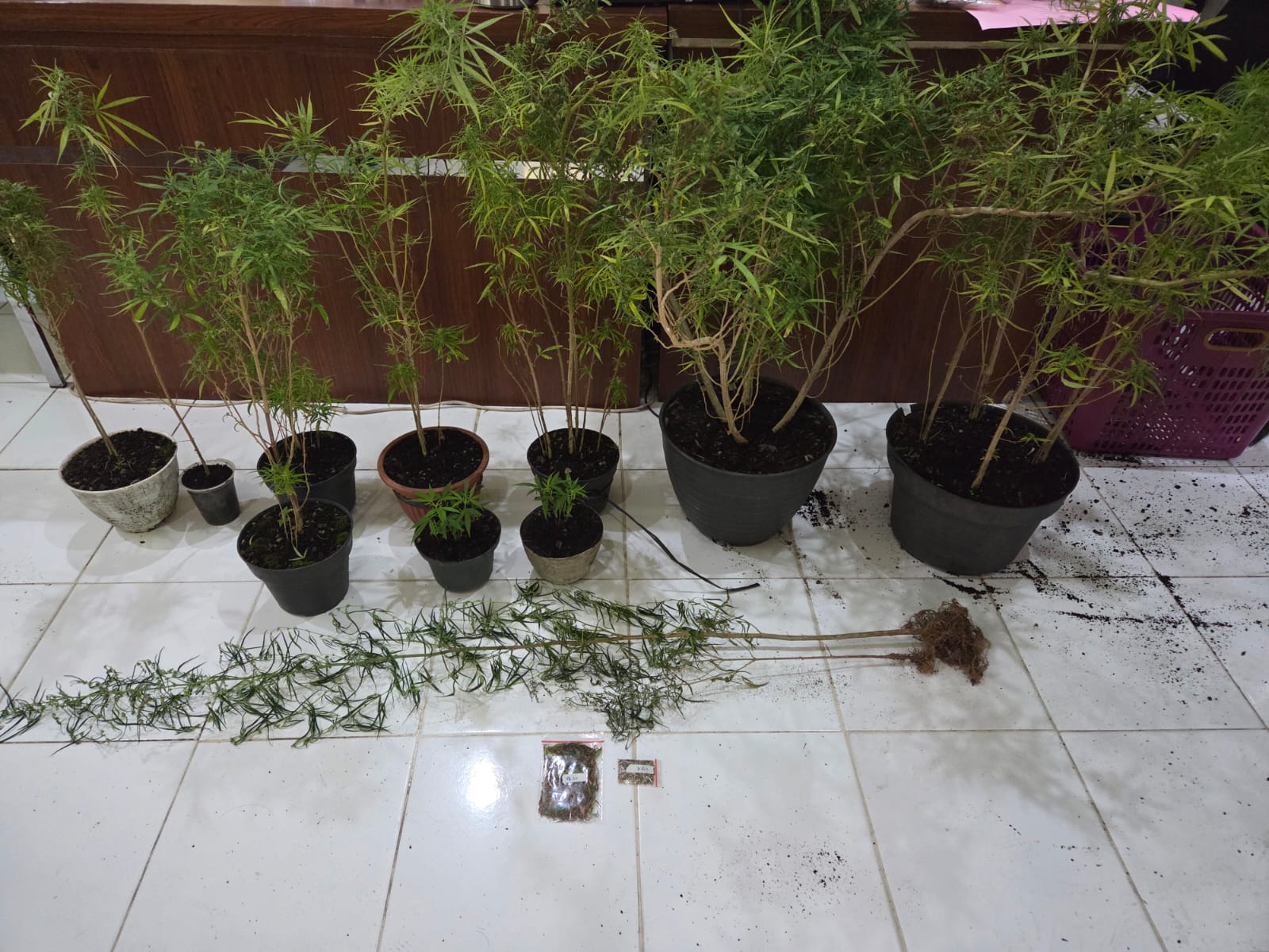 Petugas selanjutnya mengamankan tersangka A (50) di wilayah yang sama. Dari tangan A, ditemukan dua pot kecil berisi 10 batang ganja berusia dua minggu, delapan pot berisi 33 batang ganja berusia sekitar tiga bulan, dua batang ganja ukuran sedang, daun ganja kering seberat 4,10 gram, biji ganja kering 3,60 gram, serta satu unit handphone.
