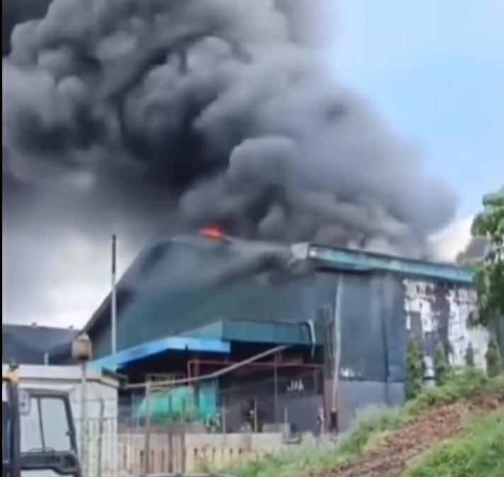 Asap hitam pekat terlihat membumbung tinggi ke udara dan menyelimuti kawasan sekitar. Peristiwa ini sempat membuat panik warga yang khawatir api akan merembet ke permukiman.