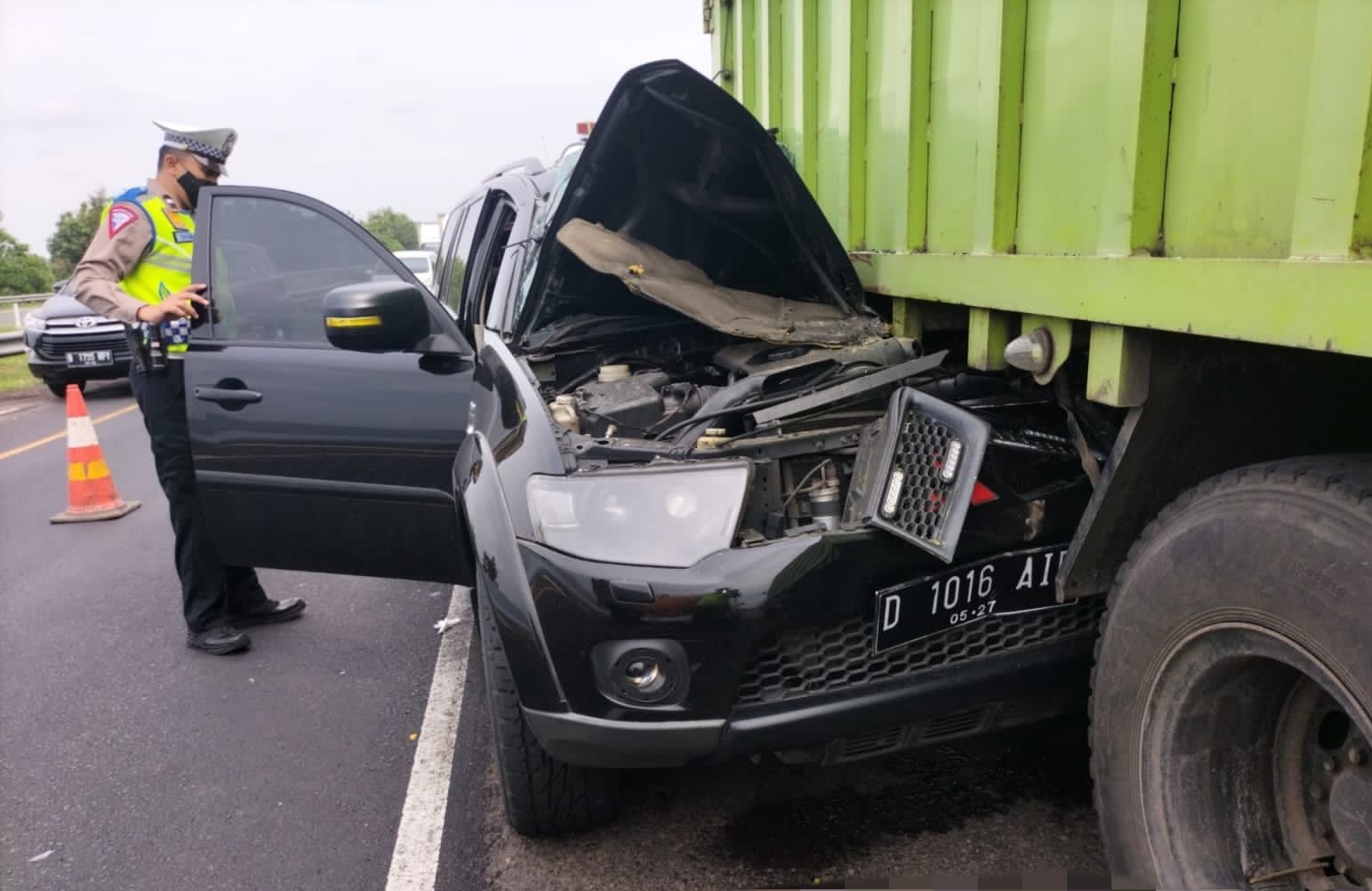 Setiba di tempat kejadian perkara (TKP) KM 106.600 jalur B, pengemudi kurang antisipasi sehingga menabrak bagian belakang kanan kendaraan tronton box Hino yang dikemudikan oleh Safei yang sedang melaju di lajur satu.