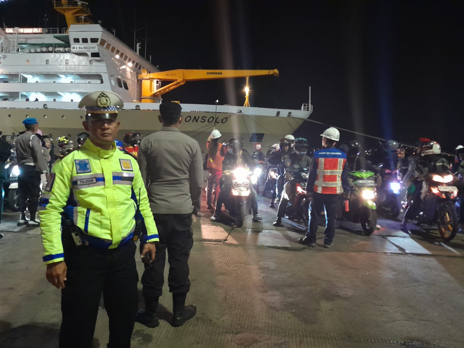 Setibanya di Pelabuhan Panjang, Ratusan pemudik yang akan menuju maupun melintasi Kota Bandar Lampung, diberikan pengawalan oleh Sat Lantas Polresta Bandar Lampung.