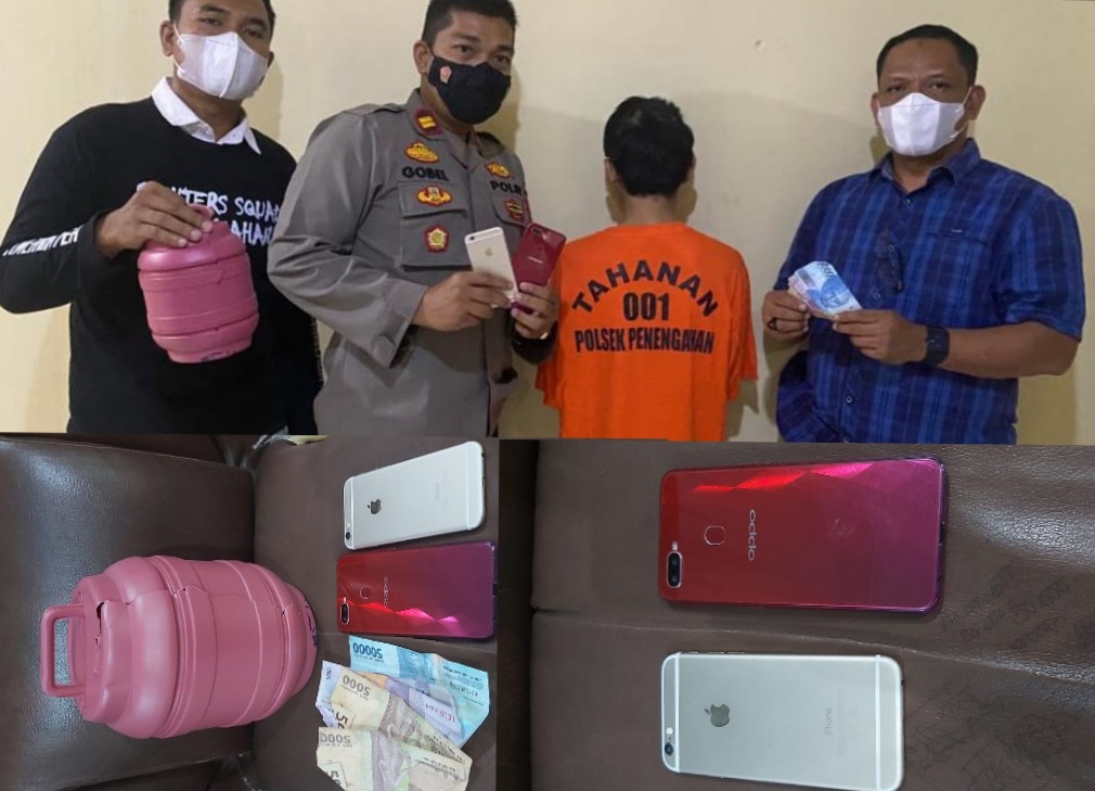 Untuk barang bukti yang diamankan dari tangan pelaku yakni, 1 unit Handphone merk Oppo c59, 1 unit Handphone merk IPhone, 1 buah celengan plastik warna merah, dan uang tunai sebesar Rp.80.000-,
