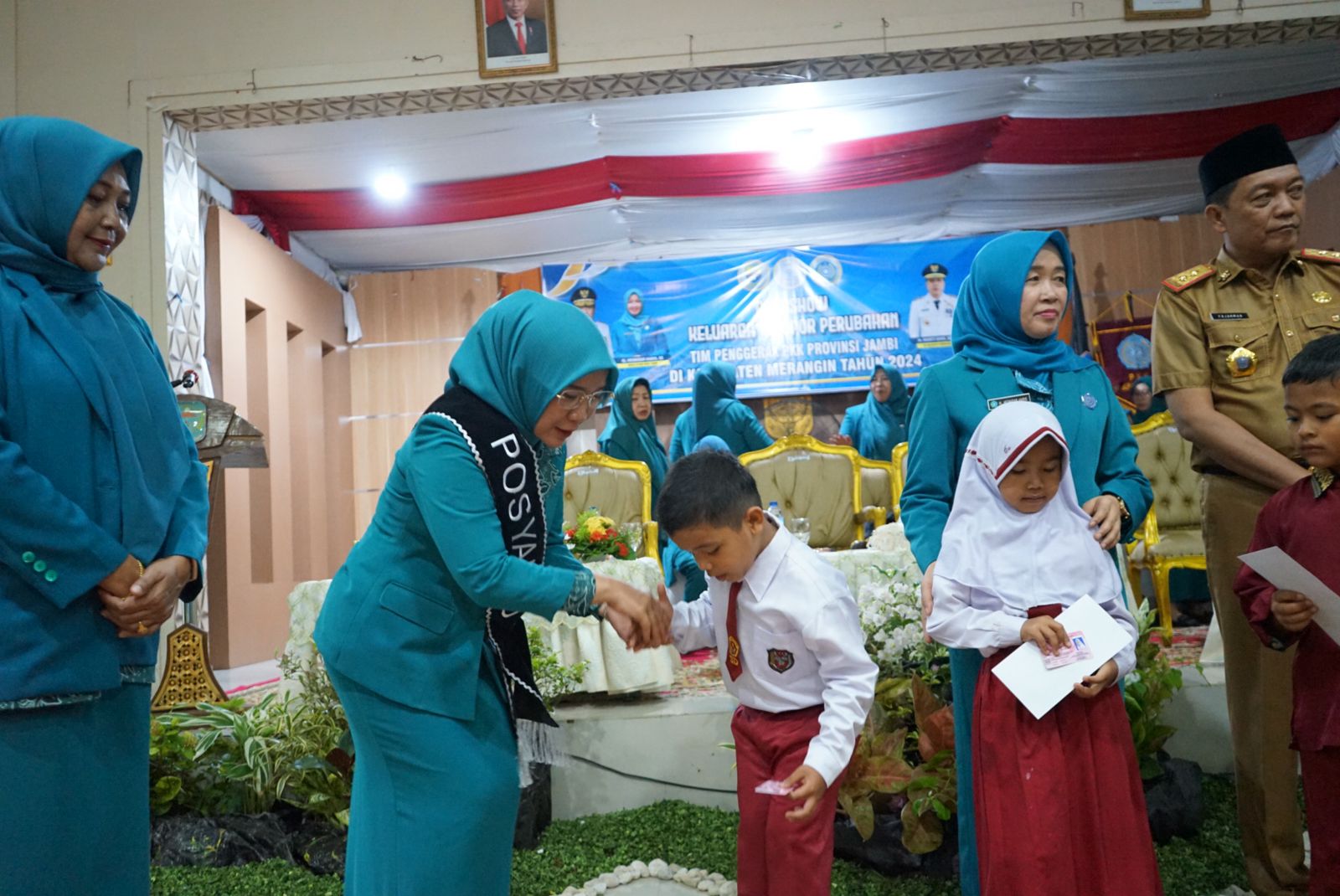 Pada kesempatan itu, Ketua TP PKK Provinsi Jambi menyerahkan Kartu Identitas Anak (KIA), penyerahan bingkisan kepada 25 orang anak Dhuafa dan bingkisan kepada 25 orang anak Stunting serta penyerahan bantuan buku untuk TMB.