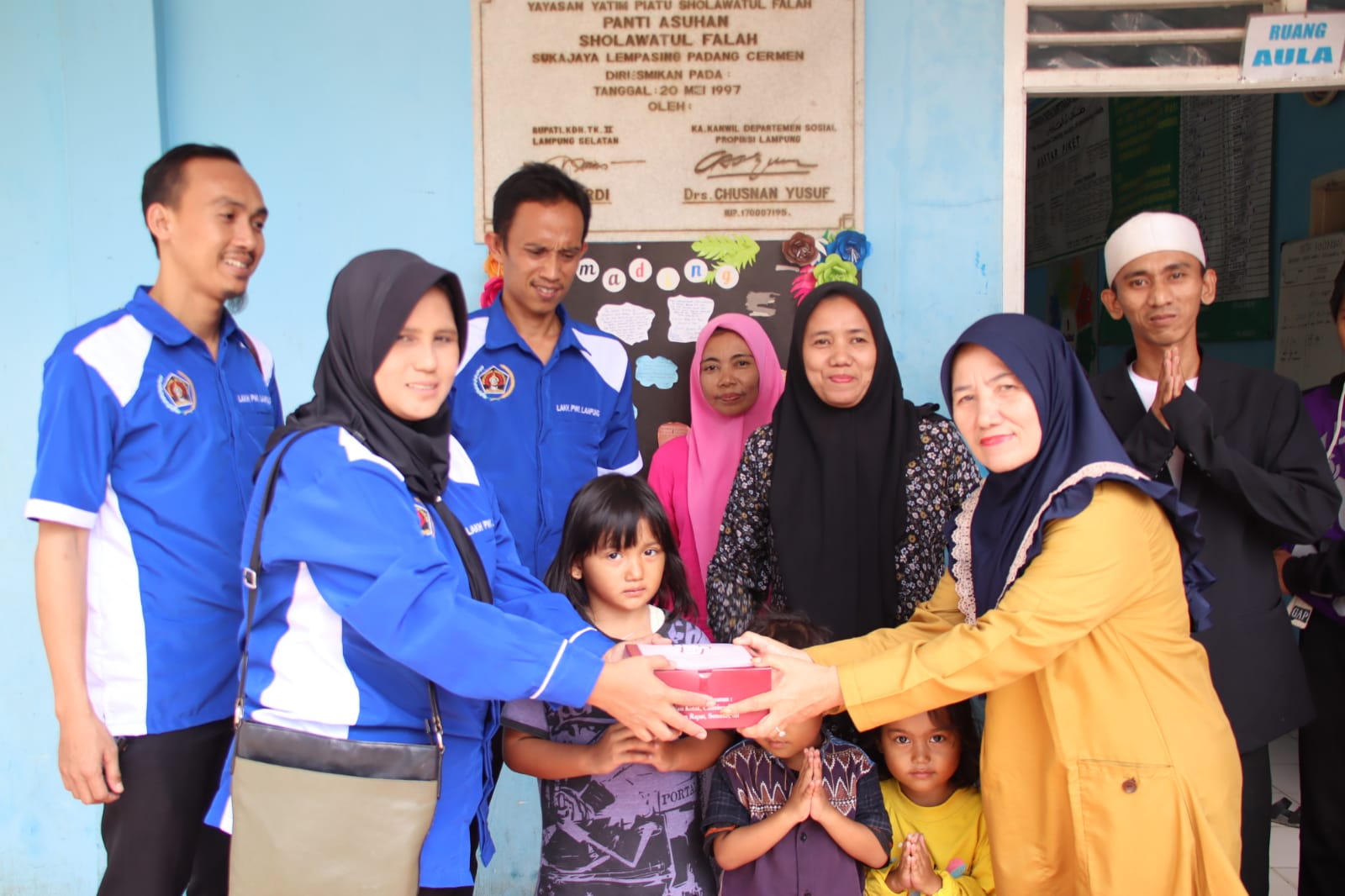 Adapun Kusmawati bersama tim LAKH Persatuan Wartawan Indonesia (PWI) Lampung membagikan nasi kotak ke Panti Asuhan Sholawatul Falah, Lempasing, Bandar Lampung.