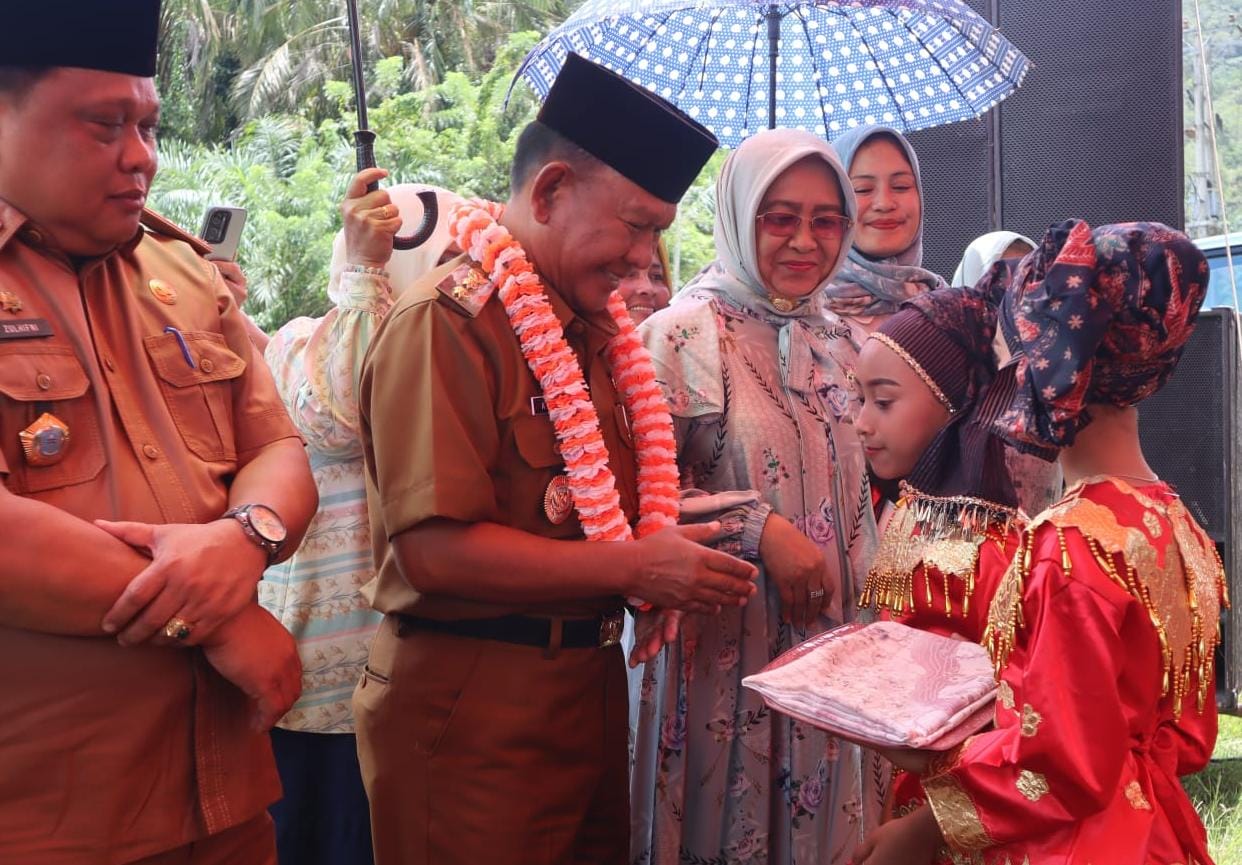 Sebelumnya begitu tiba di lokasi acara, wabup disambut tarian yang dibawakan anak-anak setempat. Selanjutnya wabup dan istri dikalungi karangan bunga lalu memasuki lokasi acara.