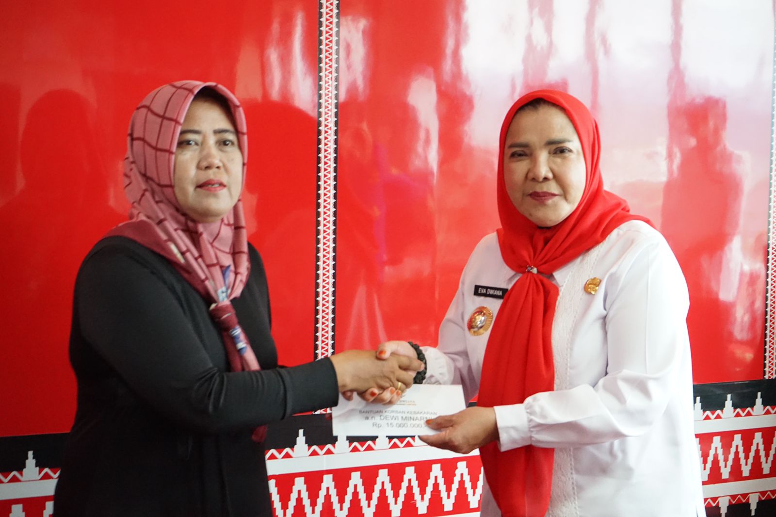 Penyerahan bantuan yang dilakukan Wali Kota Bandar Lampung Hj Eva Dwiana, di Ruang Rapat Wali Kota Bandar Lampung, sebagai bentuk perhatian pemerintah kepada korban.